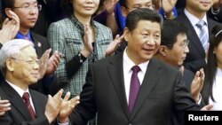 Chủ tịch Trung Quốc Tập Cận Bình nhìn Tổng bí thư Việt Nam Nguyễn Phú Trọng phát biểu trong chuyến thăm Việt Nam cuối năm 2015.